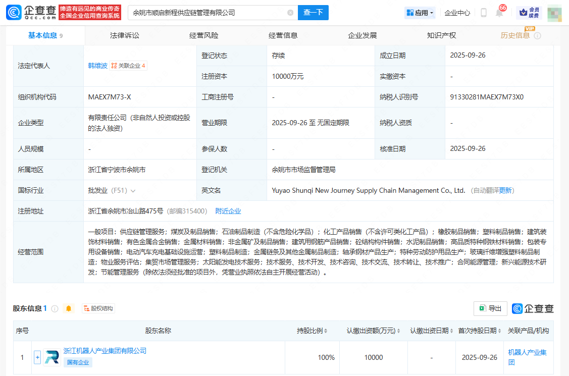 9月26日,余姚市顺启新程供应链管理有限公司成立,法定代表人为韩维波,注册资本1亿人民币,经营范围包括供应链管理服务、煤炭及制品销售、石油制品制造等。企查查股权穿透显示,该公司由浙江机器人产业集团有限公司全资持股。
